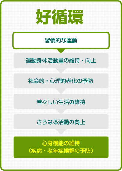 早稲田イーライフみらいグループのサービス利用で機能訓練(外出・交流を含む)されることにより、運動減少による悪循環を好循環へ転換させ、生活の質(QOL)が向上します。
